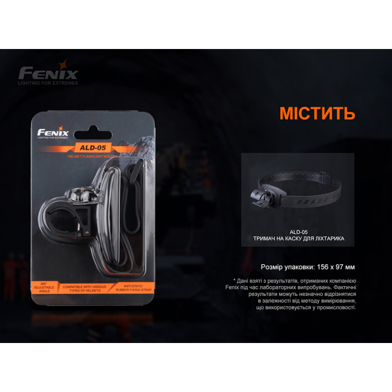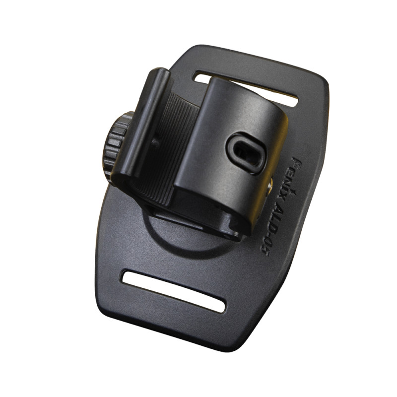 Fenix ALD-05 – це нашлемне кріплення для ліхтарів із діаметром корпусу в межах 20-28 мм. Його основу складає пластиковий тримач із регульованим кутом на 360°, що дозволяє направити світловий промінь у потрібному напрямку.