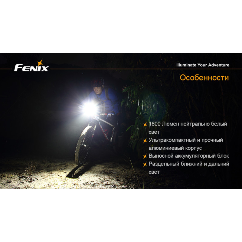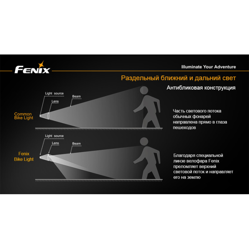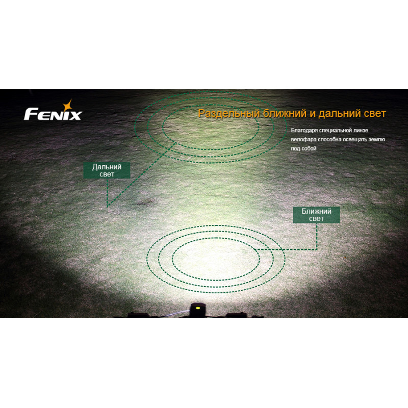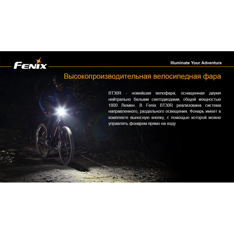 Для Fenix BT30R використовується особлива оптична технологія DualDistanceBeamSystem. Завдяки ній, промінь велофари фокусується відразу в двох точках: на ближній дистанції з широкої бічній засвіченням і на дальній. При цьому верхня частина світлового потоку спрямовується під переднє колесо велосипеда, що дозволяє уникнути сліпих зон і не зліпити учасників зустрічного руху. Яскравість освітлення для велофари Fenix BT30R можна вибирати з п'яти різних варіантів у межах від 100 до 1800 люмен. Крім того, передбачений миготливий режим Flashing, який забезпечить велосипедисту додаткову безпеку в умовах поганої видимості.