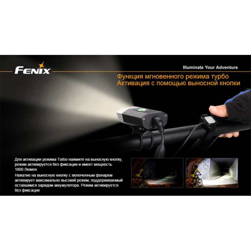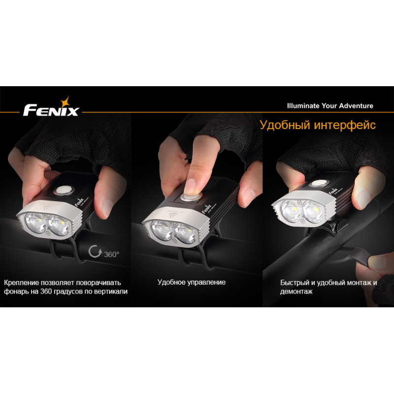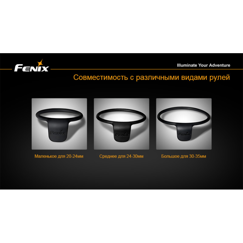 Fenix BT30R підходить для закріплення на велосипедних рулях різного діаметра. Для цього в комплекті передбачено кілька гумових кілець-кріплень різного розміру. Вони легко кріпляться і так само легко знімаються, коли виникає така необхідність. Щоб велосипедист в будь-який момент міг скористатися максимальною яскравістю турборежиму, на кермо кріпиться кнопка моментального доступу до світла.