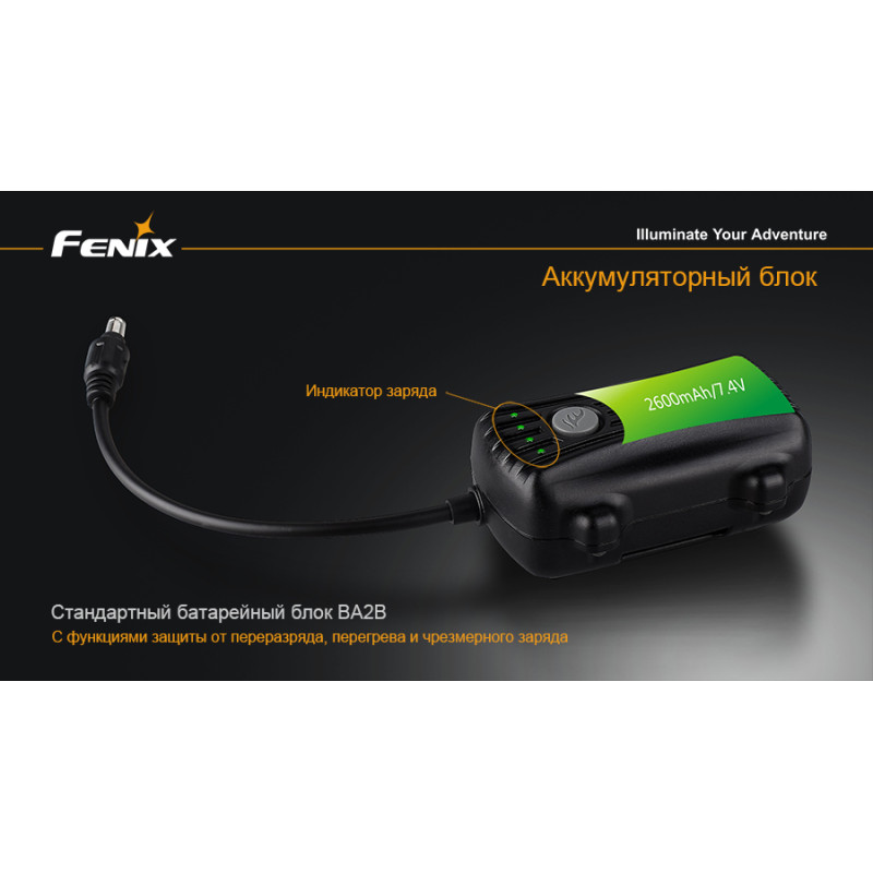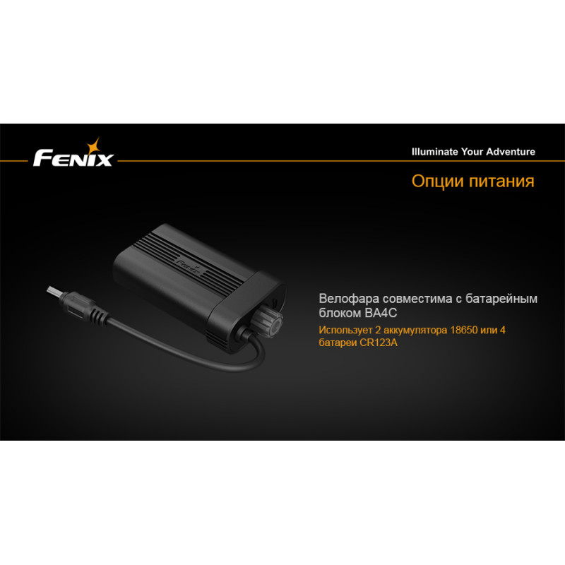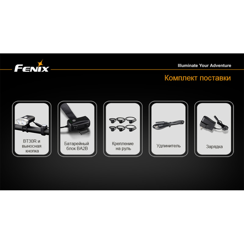 Велофара Fenix BT30R отримує живлення від зовнішнього акумуляторного блоку, розробленого спеціально для цієї моделі. Ємність цього блоку складає 2600 маг, а поповнити заряд можна за допомогою зарядки, яка входить в стандартний комплект постачання. Крім того, можна підключити звичайний акумуляторний блок, що вміщає 2 батареї розміру 18650, який потрібно докуповувати окремо.