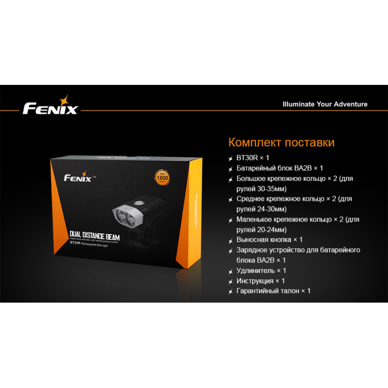 Гарантія: На велофару FenixBT30R кожен покупець отримує офіційну гарантію, дійсну протягом 24 місяців з дати здійснення покупки. За умови реєстрації коду велофари на офіційному сайті компанії Fenix, гарантія продовжується ще на 6 місяців.