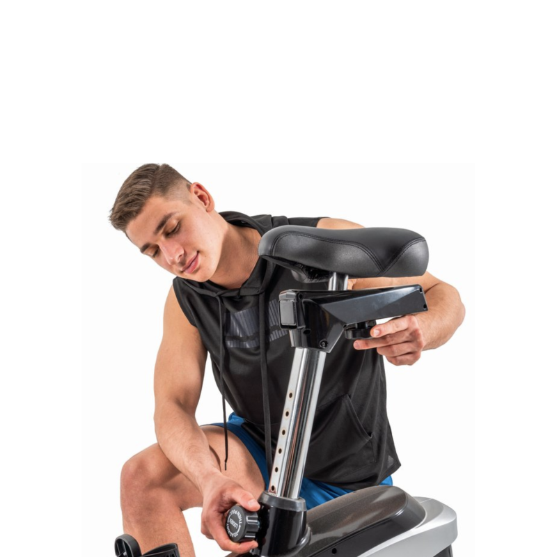 Армированная стальная конструкция и нескользящие педали с фиксирующими ремешками гарантируют безопасность во время каждой тренировки. Удобное сиденье регулируется по вертикальной и горизонтальной осям, также меняется высота руля и угол наклона рулевого управления, поэтому Вы сможете максимально комфортно подстроить параметры тренажера под свои нужды.