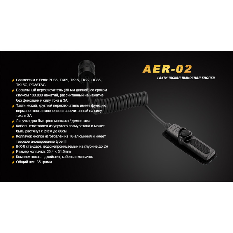 Компанія Fenix випустила більш досконалий варіант відмінно себе зарекомендували тактичних кнопок. Модель отримала назву Fenix AER-02. Така кнопка складається з корпусу-адаптера, який замінює собою звичайний хвостовик ліхтаря. Вона зроблена з металу і покрита шаром анодування Premium Type III. Перехідник щільно накручується на корпус ліхтаря і виключає будь-яке попадання всередину вологи або бруду. Безпосередньо включити ліхтар можна, скориставшись контактною площадкою. На відміну від попередньої модифікації, кнопка Fenix AER-02 також дозволяє вибрати потрібний режим роботи ліхтаря за рахунок другого перемикача. Обидва вони працюють повністю беззвучно і збережуть працездатність принаймні на 100 000 кліків. Перераховані деталі тактичної кнопки з'єднані шнуром, скрученим кільцями як у стаціонарних телефонів. Завдяки тому, що такий провід легко розтягується, контактну площадку можна винести на 80 см від ліхтаря. Вона кріпиться за допомогою липучок — ще одного нововведення виробників, яке спрощує швидку фіксацію аксесуара.