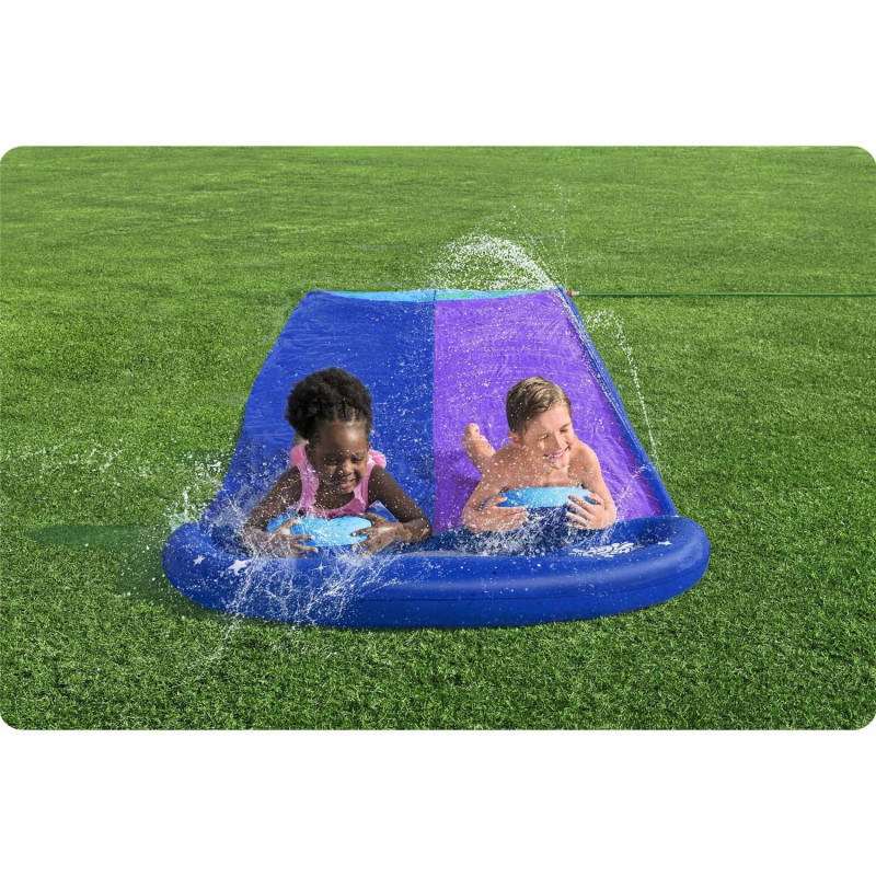 Гірка для двох осіб - класична розвага для дітей старше 3 років. Проста установка - просто розкладіть, прикріпіть і підключіть садовий шланг. Спеціальні запобіжники забезпечують стабільність під час використання. У комплект входять дві надувні подушки із зображенням космічного корабля, що додають грі веселощів і барв. Це не тільки цікава розвага, а й спосіб долучитися до здорового активного відпочинку на свіжому повітрі. Ідеальний спосіб провести вільний час і створити спогади у себе на подвір'ї.