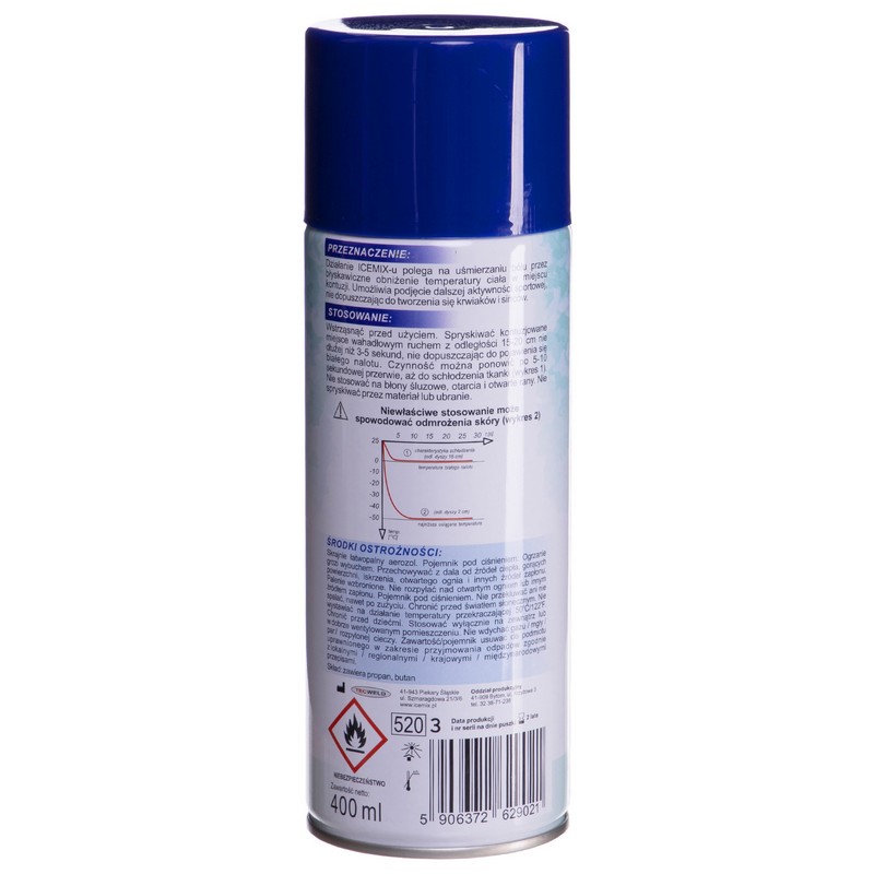 Основа спрея – сжиженный газ (пропан, изобутан), который чрезвычайно летуч в обычных условиях. Испаряясь, он резко понижает температуру в месте травмы и тем самым облегчает боль. При этом активные ингредиенты, представляющие собой смесь натуральных эфирных масел, проникают в ткани и снимают воспаление. Заморозка расфасована в компактные и удобные в хранении алюминиевые баллоны. Конструкция клапана и распылителя позволяет наносить спрей точно на поражённый участок тела, удерживая баллон под любым углом.