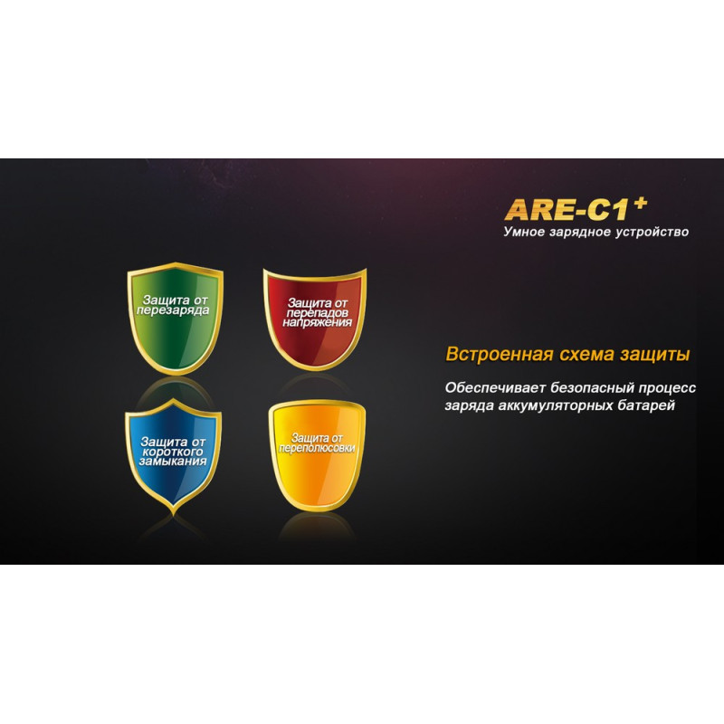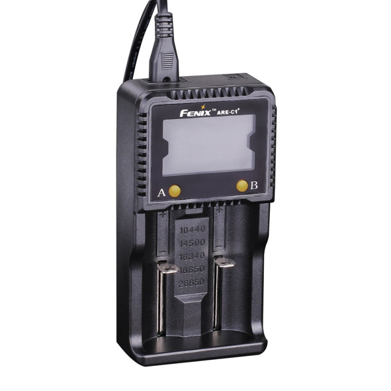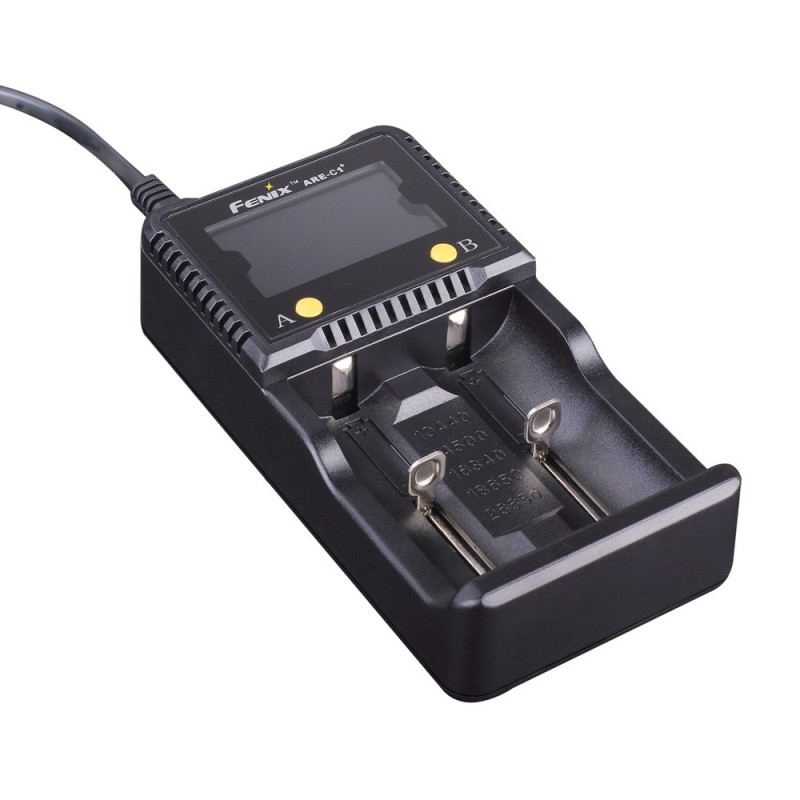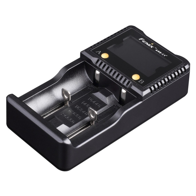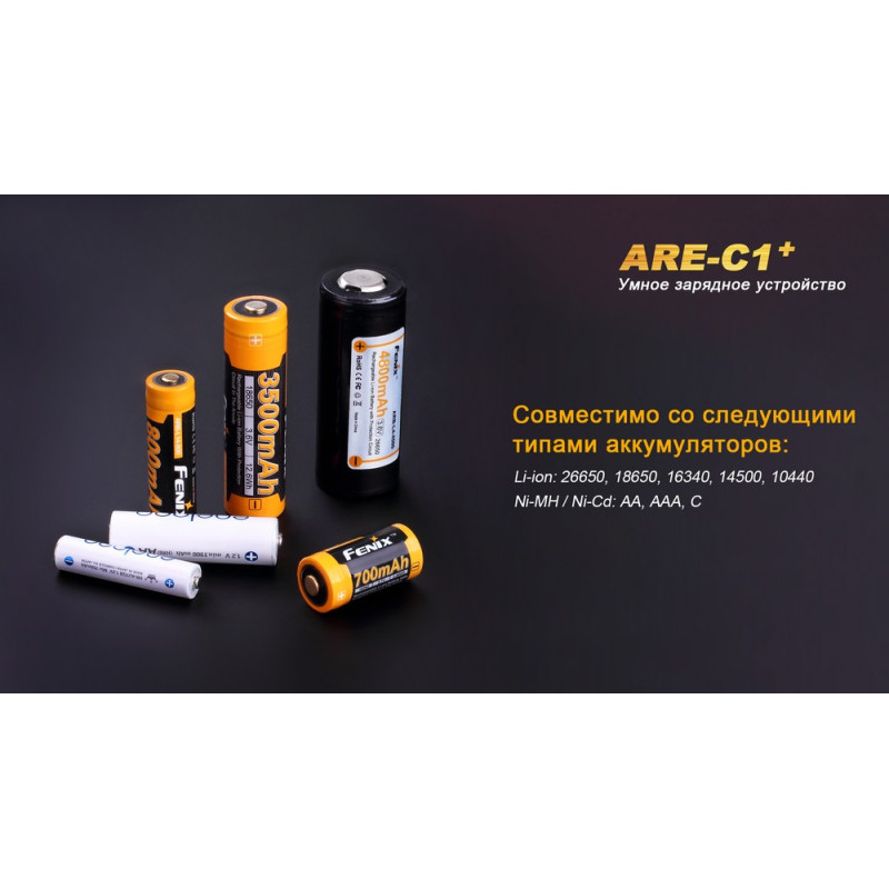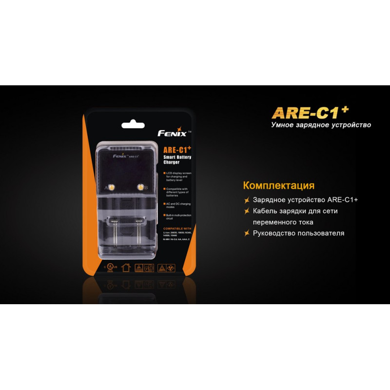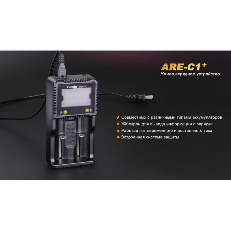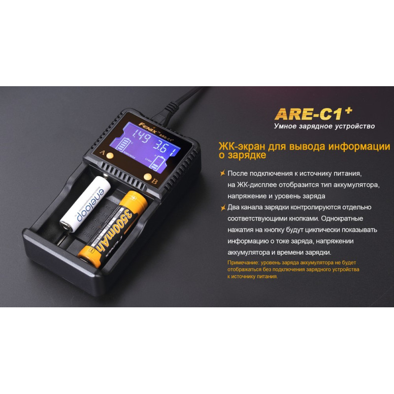 Пристрій Fenix ARE-C1+ створено для зарядки пари елементів живлення одночасно. Воно підходить для великої кількості акумуляторів різного розміру і типу. Так, сумісними є літій-іонні батареї 18650, 26650, 16340, 14500, 10440. Крім того, можлива зарядка нікель-металгідридних, нікель-кадмієвих акумуляторів форматів АА, ААА, С. Причому, завдяки ізольованості каналів один від одного, можна заряджати навіть різні елементи живлення в один час. Деталі щодо процесу зарядки будуть відображені на екрані, який розміщується поруч зі слотами. Дані про кожного з акумуляторів стають доступні після натискання відповідної його осередку кнопки. На екрані відображається акумулятора вольтаж, сила струму та час зарядки. Що стосується часу, то про нього повідомляє зображення акумулятора з тим чи іншим кількістю рисок. Якщо блимає тільки одна, то рівень заряду нижче 20%. Одна світиться і одна миготлива говорять про рівень заряду 20-40%. Поява третин рисочки — 40-60%, четвертої — 60-80%, п'ятої — понад 80%. Коли всі п'ять рисок світяться, а не блимають — акумулятор заряджений на всі 100%. Повний час зарядки залежить від типу і ємності встановленого елемента живлення.