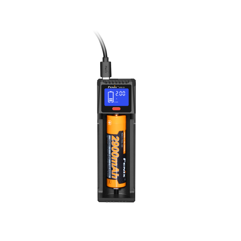 Екран зарядного пристрою Fenix ARE-D1 включається на 2 секунди після установки акумулятора і підключення до мережі. Ця модель самостійно визначить тип батареї, обере для неї відповідну програму зарядки. В результаті одноразового натискання на кнопку, на екрані циклічно будуть відображатися дані про струмі заряду, напрузі акумулятора, заряду ємності, часу зарядки. Якщо потримати кнопку натиснутою довше 2 секунд, екран вимкнеться.