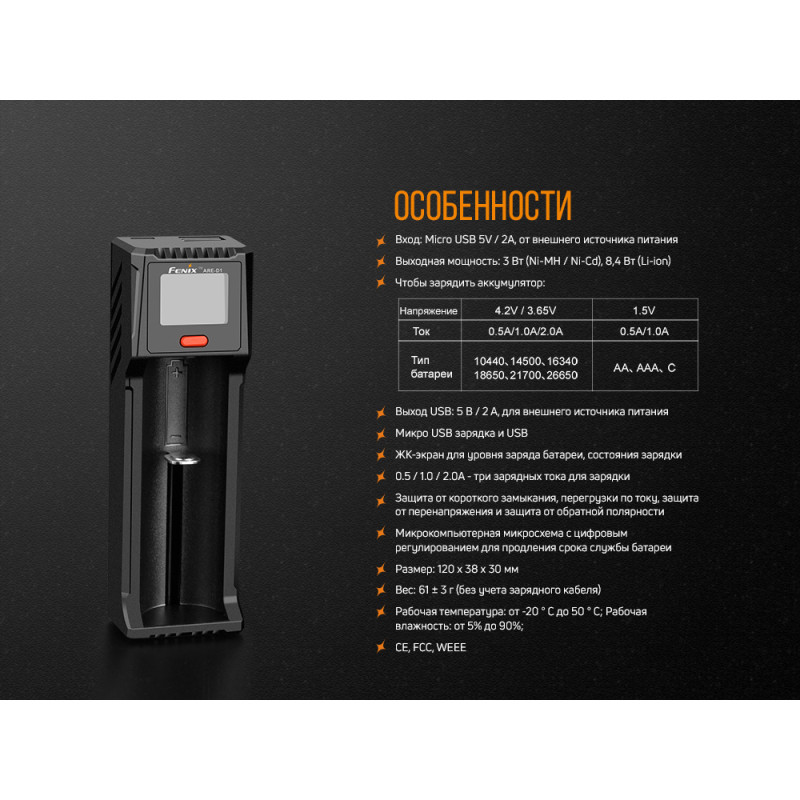 Модель Fenix ARE-D1 – це сучасне зарядний пристрій з 1 слотом для акумулятора. Воно підходить практично для будь-яких умов використання та сумісно з елементами живлення 9 різних типорозмірів. Серед літій-іонних акумуляторів підходять формати 10440, пальчикові 14500, 16340, популярні для ліхтарів 18650, 21700, 26650. Нікель-металгідридні або менш поширені нікель-кадмієві – це формати ААА, АА, С. Слот зарядного пристрою забезпечений рухомий притискної частиною, яка забезпечує щільну фіксацію кожному з перерахованих акумуляторів.