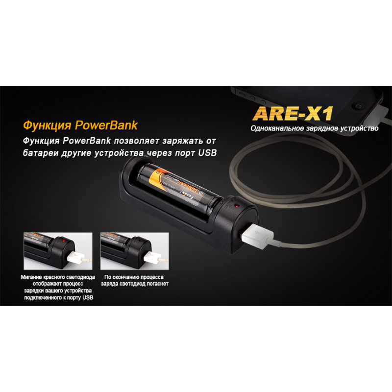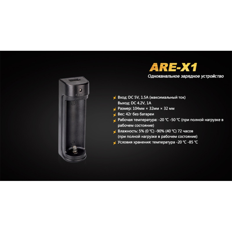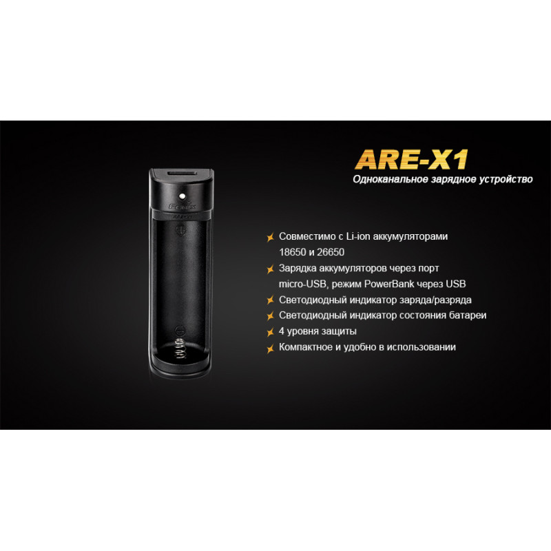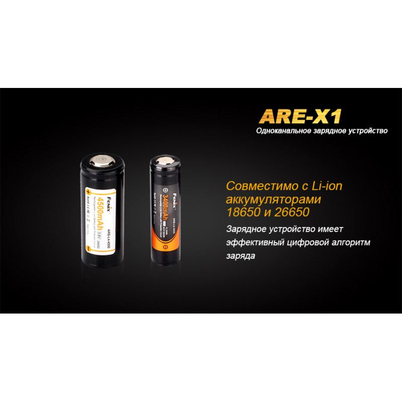 Модель Fenix ARE-X1 орієнтована на тих людей, для яких важлива мобільність. Це зарядний пристрій максимально легке за рахунок того, що в ньому всього один слот для акумуляторів. Зате воно сумісне з літій-іонними елементами живлення відразу двох стандартів: 18650 і 26650. Щоб акумулятори довше зберігали свою початкову ємність, зарядний пристрій оснащений всіма сучасними захисними механізмами. Зокрема, виробники передбачили захист від їх надмірного заряду і від перерозряду. Крім того, акумулятори захищені від переполюсовки, а саме зарядний пристрій — від виникає в результаті недотримання полярності короткого замикання.
