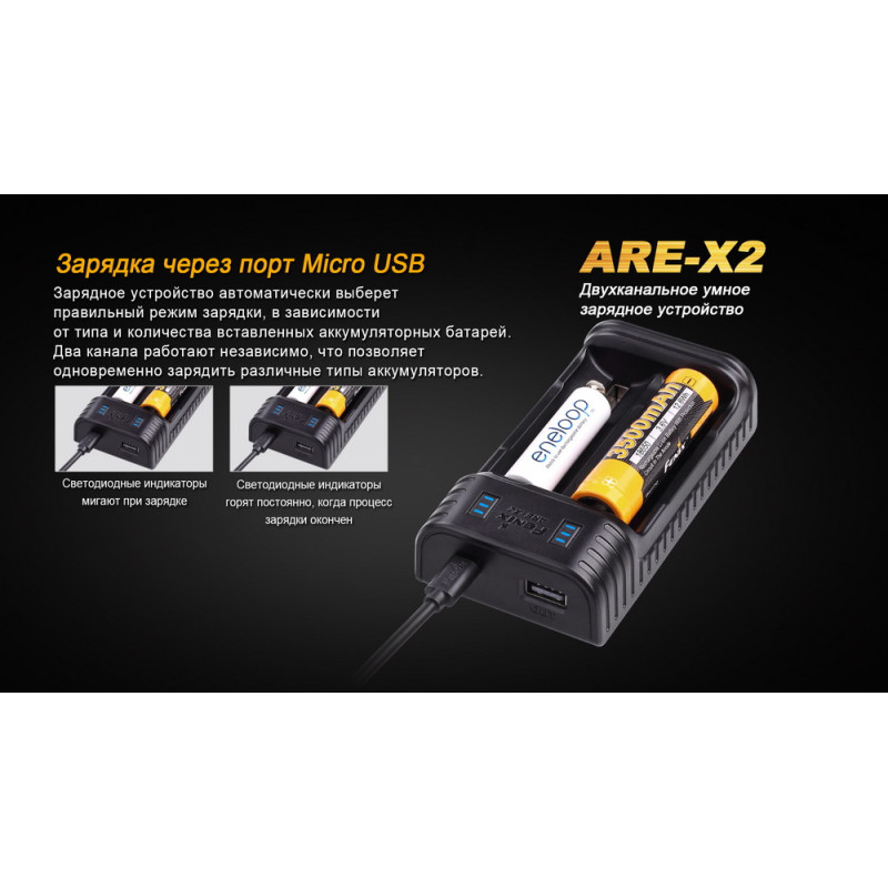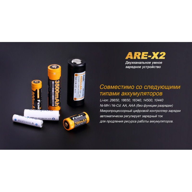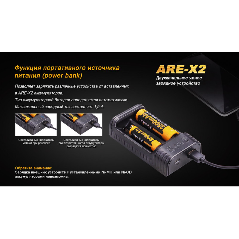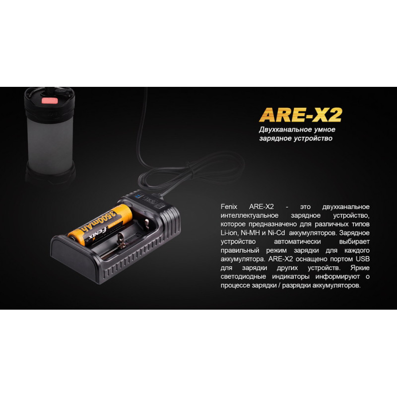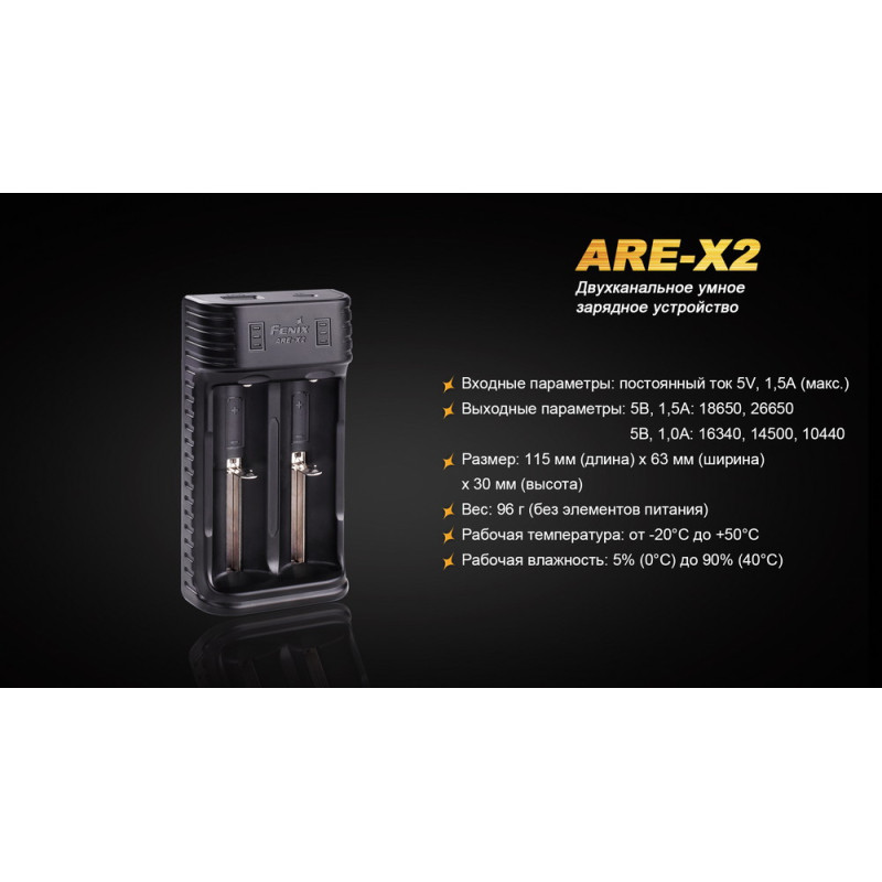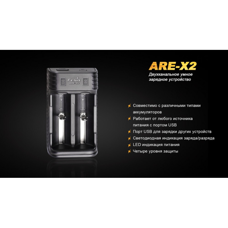 Модель Fenix ARE-X2 орієнтована на тих людей, для яких важлива мобільність. У цьому зарядному пристрої 2 слоти для акумуляторів. Воно сумісне з літій-іонними елементами живлення таких стандартів: 10440, 14500, 16340, 18650, 26650 і Ni-MH або Ni-Cd акумулятори AA, AAA. Щоб акумулятори довше зберігали свою початкову ємність, зарядний пристрій оснащений всіма сучасними захисними механізмами. Зокрема, виробники передбачили захист від їх надмірного заряду і від перерозряду. Крім того, акумулятори захищені від переполюсовки, а саме зарядний пристрій — від виникає в результаті недотримання полярності короткого замикання.