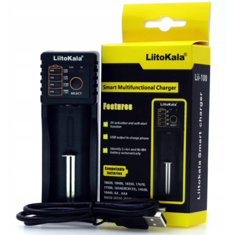 LiitoKala Lii 100 Battery Charger - універсальний зарядний пристрій на 1 акумулятор з можливістю вибору струму заряду та з функцією Power Bank. Зарядний пристрій підходить для заряджання акумуляторів АА, ААА, 18650, 14500, 16340, 18500 та ін з різною хімією елементів: Ni-Mh, Ni-Cd, Li-Ion, LiFePO4. Підходить для будь-яких циліндричних акумуляторів діаметром до 26 мм та довжиною до 71 мм. Даний зарядний пристрій дозволяє самостійно встановлювати струм заряду 500 або 1000 mA, завдяки чому він може швидко заряджати акумулятори високої ємності.