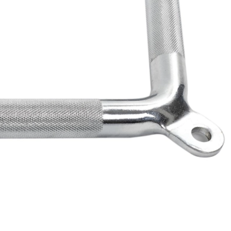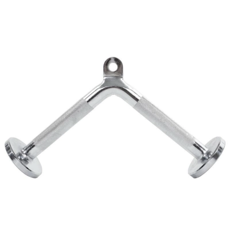 Хромована конструкція V-подібної ручки для верхньої тяги забезпечує надійний та комфортний хват під час виконання вправ, що важливо для забезпечення безпеки та ефективності тренувань. Ручка оснащена обертовим підвісом, що вільно обертається, забезпечуючи плавний, безперервний рух під час виконання вправ. V-подібна форма створює специфічний ергономічний хват, що дозволяє забезпечити оптимальну підтримку для рук під час роботи з великим навантаженням.
