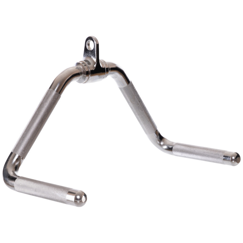 Аксесуар виготовлений із високоякісної сталі, підданої хромуванню для захисту від корозії. Має покриті насічками області захватів, що запобігає зісковзування рук і дозволяє спортсмену надійно утримувати рукоятку навіть при роботі з важкими вагами. Завдяки підвісу, що обертається, трос не перегинається, і спортсмен контролює траєкторію свого руху під час виконання вправ.