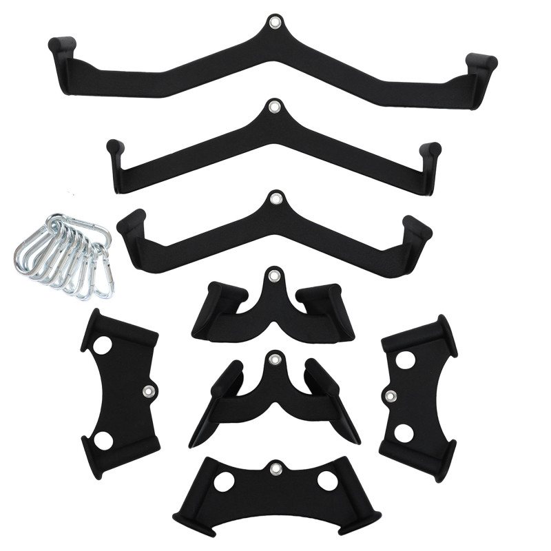 Для зручності використання кожна рукоятка оснащена полівінілхлоридним покриттям, яке забезпечує надійне захоплення навіть при інтенсивних тренуваннях. Крім того, комплект включає 8 карабінів, що полегшує швидку зміну аксесуарів на тренажері. Правильне використання набору гарантує максимальну ефективність тренувань.