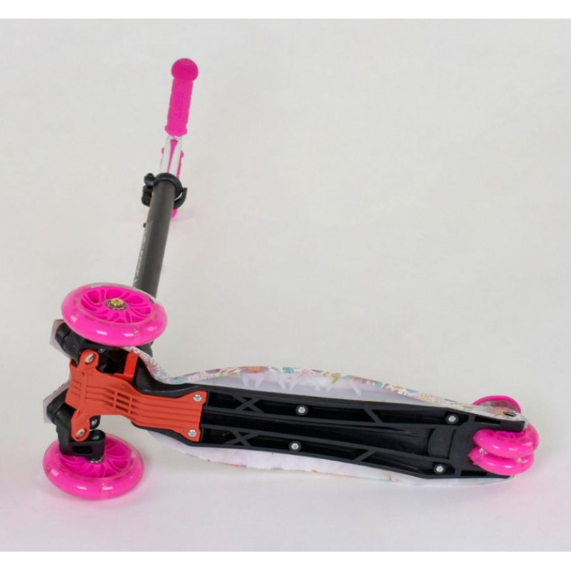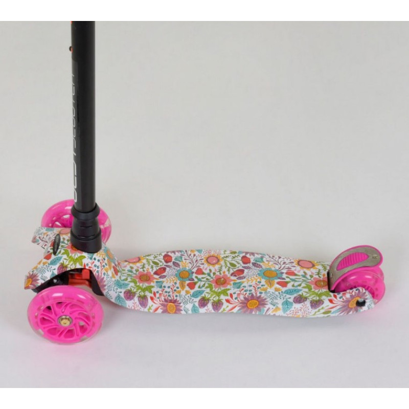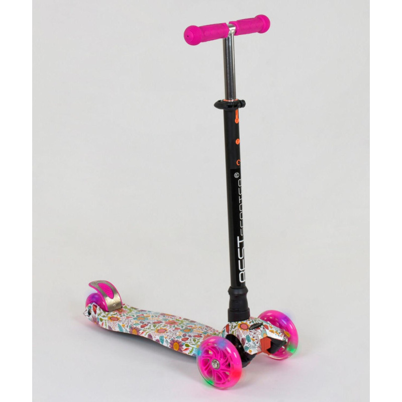 Триколісний самокат з колесами, що світяться від “Best Scooter” призначений для маленьких любителів активного відпочинку. Яскравий дизайн цієї моделі з першого погляду приверне увагу малюка і стане улюбленим транспортним засобом!За рахунок триколісної конструкції та здвоєного заднього колеса самокат досить стійкий і запобігає падінню під час катання.Пластмасова дека самокату виконана із міцного матеріалу та кріпиться на раму.Т-подібне кермо має міцну металеву основу. Висота керма фіксується у 3х положеннях. Фігурні грипси виконані з гуми з рельєфними візерунками, які запобігають зісковзанню долоні з керма під час катання.Похила система повороту керма забезпечує максимально легке та безпечне керування самокатом. Особливості моделі: - яскравий та стильний дизайн;- Кола, що світяться;- Регулювання висоти керма;- похила система повороту керма;- Гумові грипси;- ножне гальмо на задньому колесі; Характеристики: - поліуретанові колеса;- ширина керма – 26 см;- Висота керма регулюється від 77 см до 86 см, з фіксацією в 3х положеннях;- Розмір деки - 55 х 13 см;- Розміри коліс:передні колеса: діаметр –12см, ширина – 2.4 см;задні колеса: діаметр – 8 см, діаметр – 2.4 см; Матеріали: Кермо – алюміній;Дека – пластик;Колеса – поліуретан (PU).