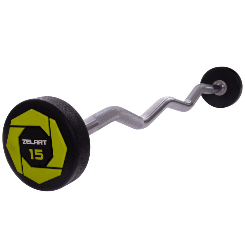 Штанга нерозбірна з фіксованою вагою вигнута поліуретанова Zelart Urethane Barbell TA-2690-15 довжина-104см 15кг чорний-салатовий