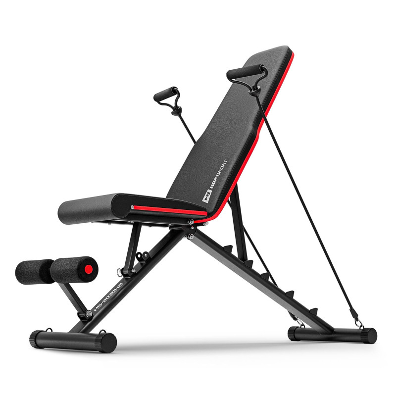Лавка 2030HB від Hop-Sport - універсальна і функціональна окремо стояча лавка. Регульовані спинка і сидіння, а також фіксатор для ніг, дозволяють тренувати різні групи м'язів. У комплект входять еспандери для проведення розминки і ще більш ефективних тренувань. Додатковою перевагою даної моделі є можливість складати її після тренування.