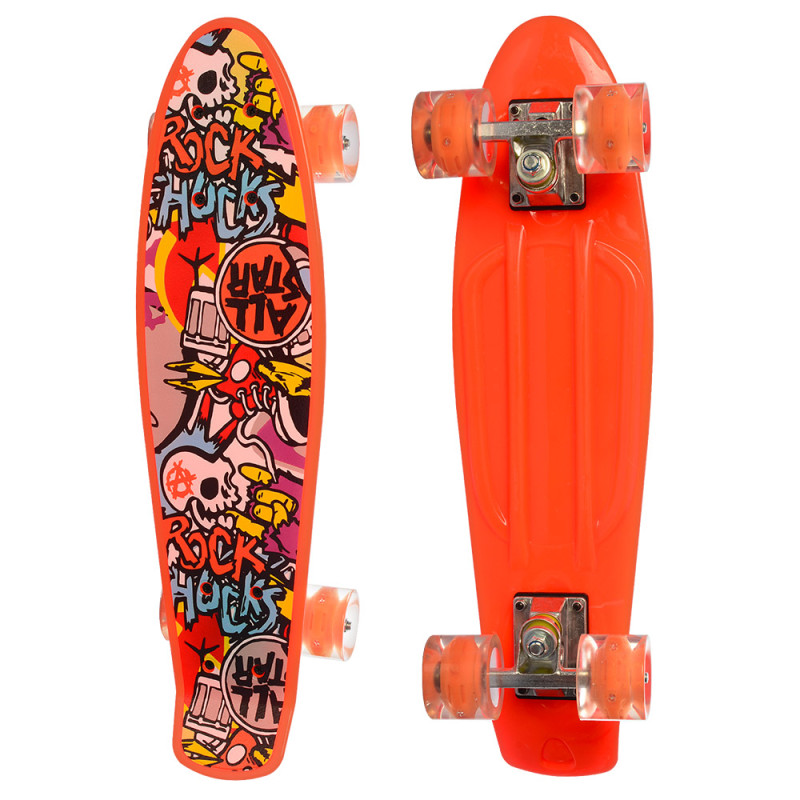 Ця модель має довжину 55 см і ширину 15 см, матеріал з якого зроблена дошка - посилений пластик і витримує навантаження до 70 кг. Поверхня скейту має ребристу поверхню, тому під час катання нога не зісковзуватиме. Колеса виготовлені з поліуретану з підшипниками абек 7 і мають стандартний діаметр 60 мм. Колеса світяться під час руху, чим швидше їхати, тим яскравіше вони світитимуться. Світяться вони за рахунок магнітної котушки, розташованої всередині колеса. Підвіска має середню жорсткість, щоб повертати, вам потрібно перенести вагу тіла на ребро скейту вправо або вліво. Якщо пенні борд занадто маневрений або навпаки, погано повертає, ви можете відрегулювати його підвіску спеціальним універсальним ключем.