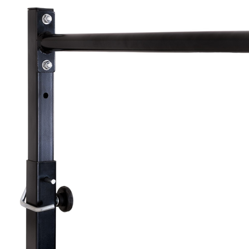 Однією з найбільших переваг цього турніка є можливість регулювати його висоту. Довжина турніка становить 121 сантиметр, а його висоту можна регулювати в діапазоні від 190 до 246 сантиметрів, що дозволяє пристосувати його до ваших потреб і типу вправ. Паралельні бруси починаються на висоті 55 см і можуть бути зміщені вгору ще на 18 сантиметрів.