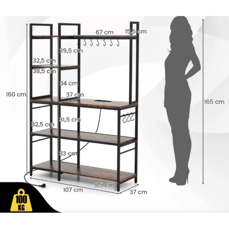 Коли практичність поєднується зі стилем, народжується щось справді унікальне. Стелаж Costway - це більше, ніж просто шафа з полицями. Це продумане рішення для сучасного дому, де цінується кожен сантиметр простору, а кожна деталь має значення. У п'ятиярусному дизайні гармонійно поєднані відкриті полиці для зберігання, зарядна станція з USB, Type-C і розетками, гачки для кухонного приладдя та міцна металева рама з дерев'яним декором у стилі Loft. Цей стелаж для кухні з розетками ідеально впишеться у вашу кулінарну зону, але також легко трансформується у кавовий бар, міні офіс або підставку для принтера. Він працює на вас: тримає порядок, забезпечує доступ до техніки, заряджає гаджети, і все це - без втрати естетики. Простір стає структурованим, організованим і, водночас, стильним. Якщо ви давно шукали спосіб поєднати стелаж у стилі лофт з розумною функціональністю - ви щойно його знайшли.