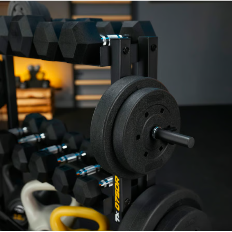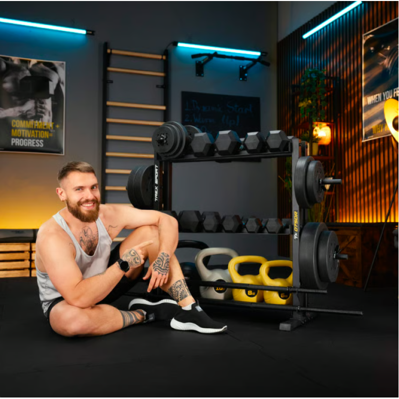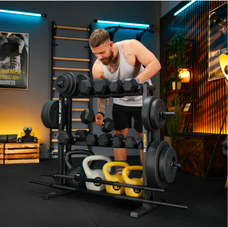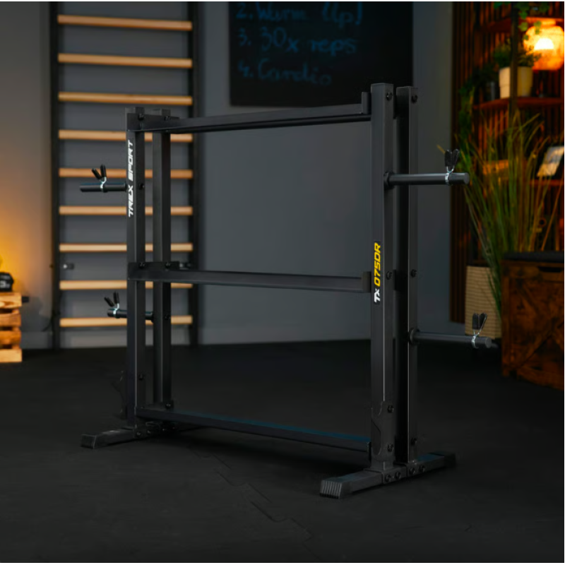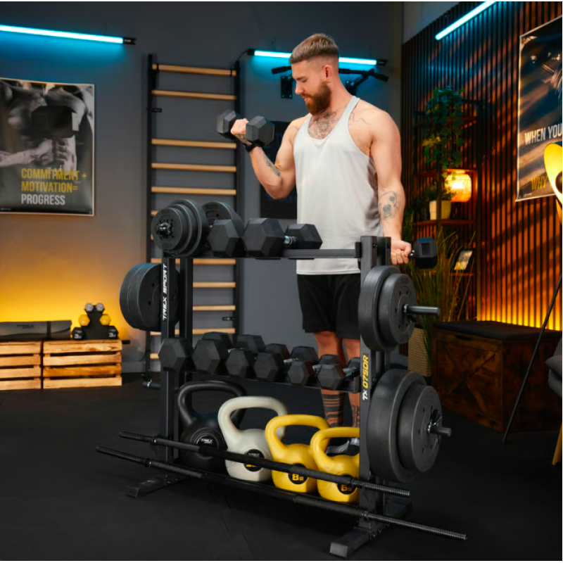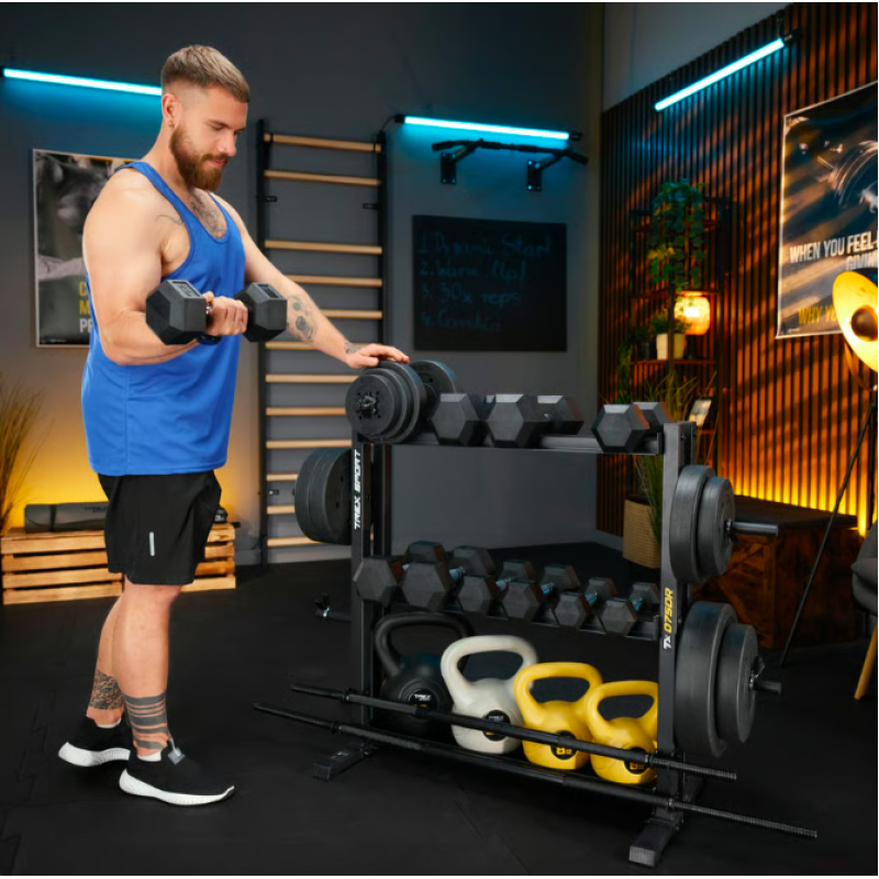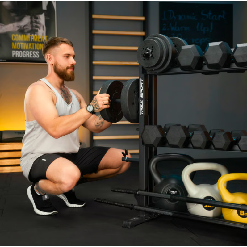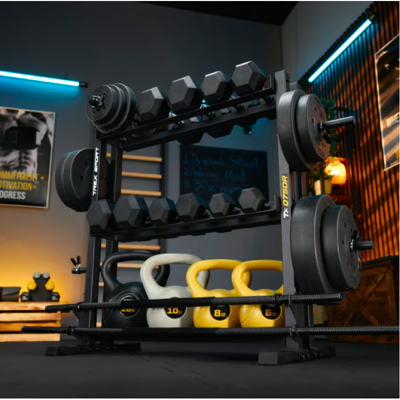 Мрієте про тренувальний простір без хаосу, де гантелі, грифи та гирі зберігаються акуратно й завжди під рукою? Стійка 3-рівнева для гантелей, грифів та гирь Trex Sport TX-075DR - це надійне рішення, створене спеціально для домашнього використання. Вона поєднує у собі функціональність, міцність і продуманий дизайн, щоб ви могли тренуватися ефективно, безпечно та з комфортом. Компактні розміри дозволяють легко розмістити її навіть у невеликому приміщенні, а продумане розташування полиць і стрижнів забезпечує швидкий доступ до будь-якого інвентарю. Якщо ви шукаєте стійку для гантелей, грифів та гирь для дому, TX-075DR стане вашим ідеальним вибором.