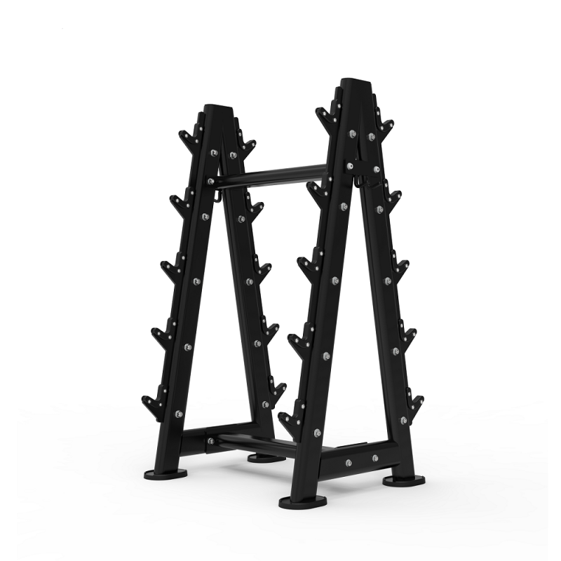 - Ефективне використання простору для організованого зберігання та зручного доступу до 10 штанг з фіксованою вагою, з прямим або вигнутим грифом.