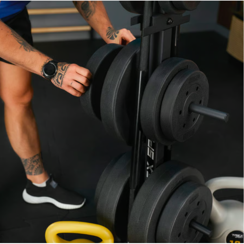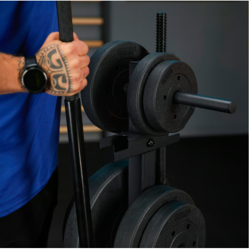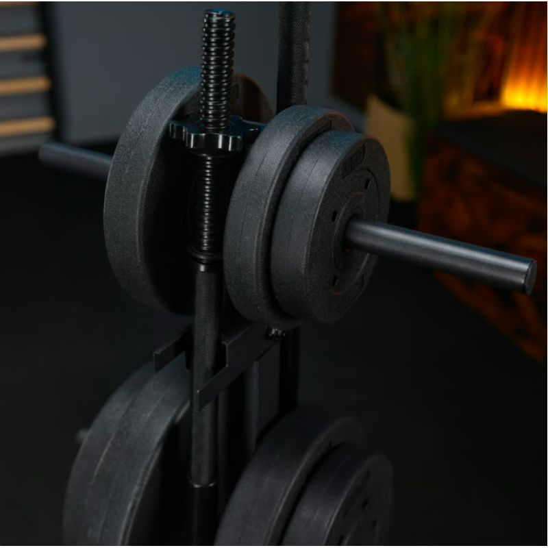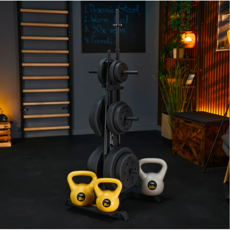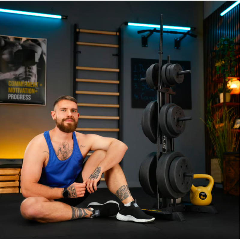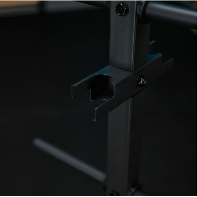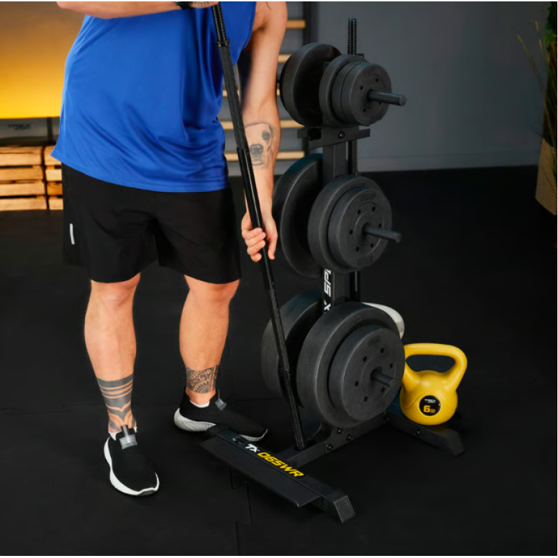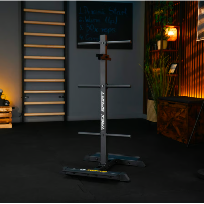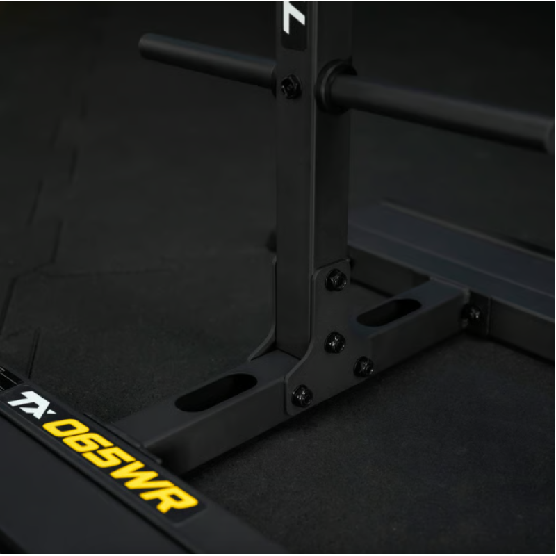 Забудьте про розкидані млинці, грифи на підлозі та зайвий безлад - з TX-065WR ваш домашній спортзал стане прикладом організованості, безпеки та зручності. Ця багатофункціональна стійка поєднує в собі стійке зберігання дисків, грифів і силових аксесуарів у компактній формі. Посилена конструкція, продумане розташування стрижнів, додаткові полиці та надійні отвори для штанг - усе продумано до дрібниць, щоб тренування проходили без зайвих турбот.