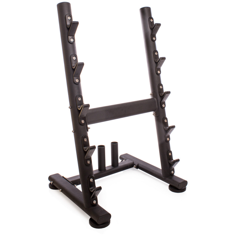 Попри компактні розміри, стійка вміщує досить значну кількість інвентарю: 5 штанг із фіксованою вагою та 3 грифи. Для штанг передбачені вигнуті гаки, а грифи встановлюються в спеціальні металеві стакани. Перевагою цієї конструкції є її універсальність - на ній можна зберігати штанги і грифи будь-якого діаметру і довжини.