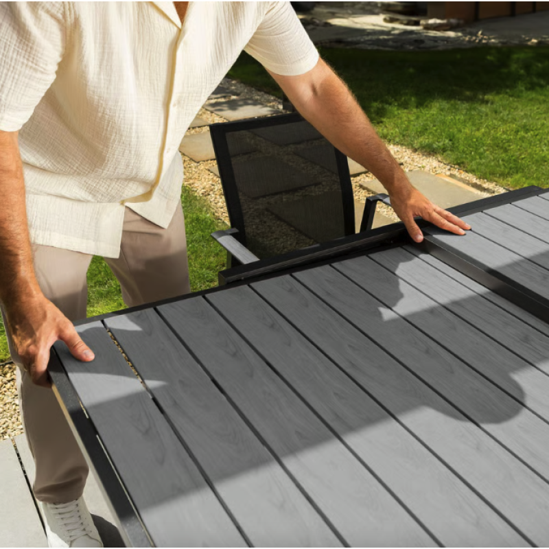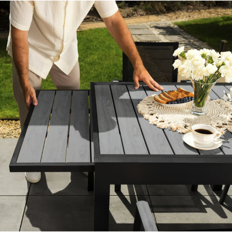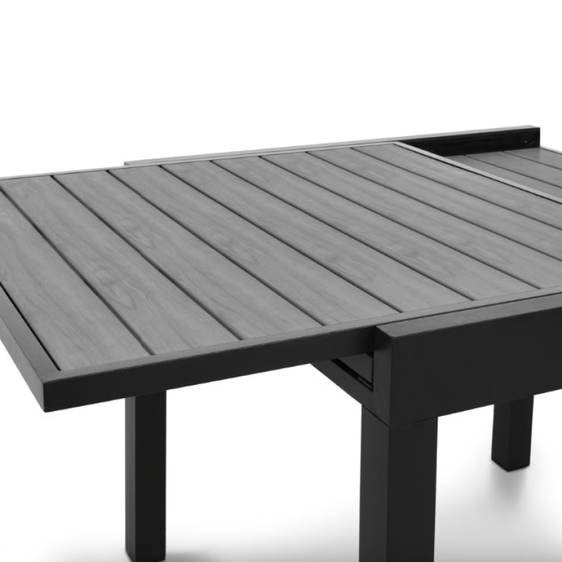 Уявіть ідеальний обід на відкритому повітрі - свіже повітря, смачні страви та приємна компанія. Але що робити, якщо гостей більше, ніж ви очікували? Розсувний садовий стіл Comlo від Di Volio легко вирішить цю проблему! Завдяки інноваційній системі складання, він адаптується до ваших потреб, розширюючись від 90см до 180см. Це ідеальне рішення для сімейних зустрічей, барбекю з друзями або несподіваних візитів гостей. Але Comlo - це не лише зручність. Його елегантний сучасний дизайн у поєднанні з міцними матеріалами робить цей стіл не лише функціональним, а й надзвичайно стильним. Чорний алюмінієвий каркас з порошковим покриттям забезпечує антикорозійний захист, а стільниця з полівуду бежевого кольору ідеально імітує натуральне дерево, додаючи меблям вишуканості та природного вигляду. Крім цього, регульовані ніжки дозволяють адаптувати висоту столу до ваших потреб та компенсувати будь-які нерівності поверхні. Стійкість, довговічність і стиль - ось що робить Comlo незамінним елементом вашого саду чи тераси!