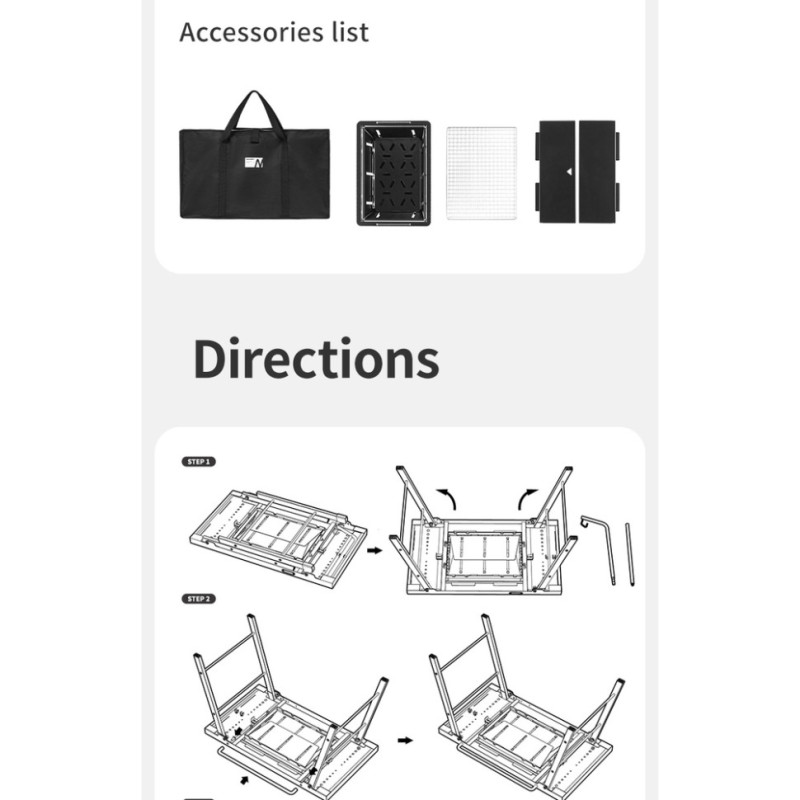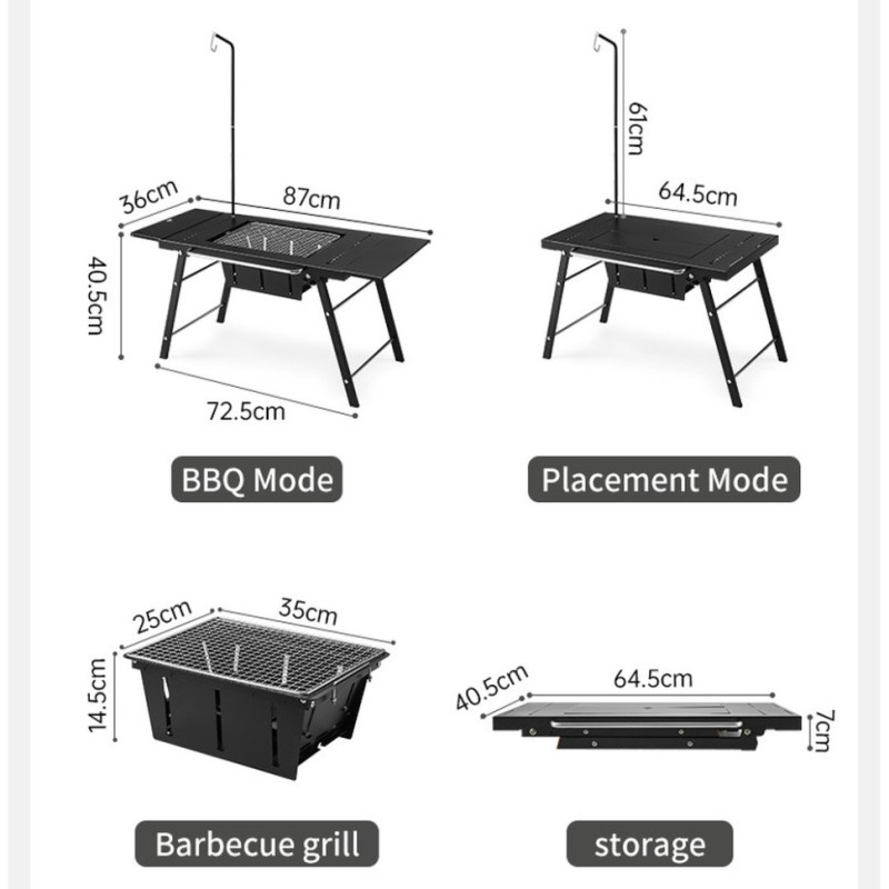 Розміри стола у встановленому положенні сягають 87 х 40,5 х 40,5 см. У конструкції передбачено гачок для кріплення ліхтаря та бічна ручка для підвішування посуду та зручного транспортування.