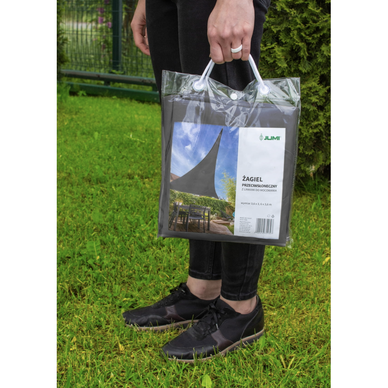 Тент-вітрило Jumi Garden - це аксесуар для затінення місця відпочинку на свіжому повітрі. Тент-вітрило розміром 3,6 х 3,6 х 3,6 комбінує унікальний дизайн, надійну якість та незаперечний комфорт у будь-яку погоду. Завдяки своїй простоті та універсальності ви зможете створити безліч комбінацій його використання. Ідеально підходить для балкона, тераси чи саду.