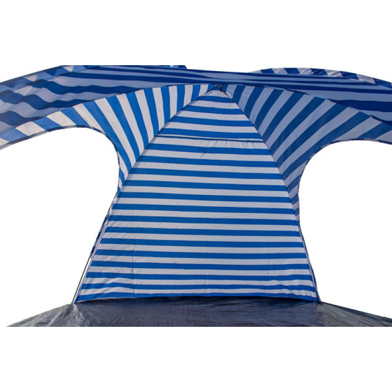 Яскравий і красивий пляжний тент, порадує ваше око і сховає від настирливого сонечка під час відпочинку або довгоочікуваної відпустки. По суті це чотиримісний намет, який легко встановлюється в будь-якій місцевості та на будь-якій поверхні. За властивостями намет одношаровий, тому якщо ви плануєте відпочинок біля річки або на землі, то бажано на підлогу постелити матеріал, що утеплює (килимок або поролонові подушки). Конструкція виробу виконана із міцного скловолокна, тому буде стійкою при поривах вітру. Модель без антимоскітної сітки. Це спрощений формат намету, що не передбачає ночівлі в ньому.