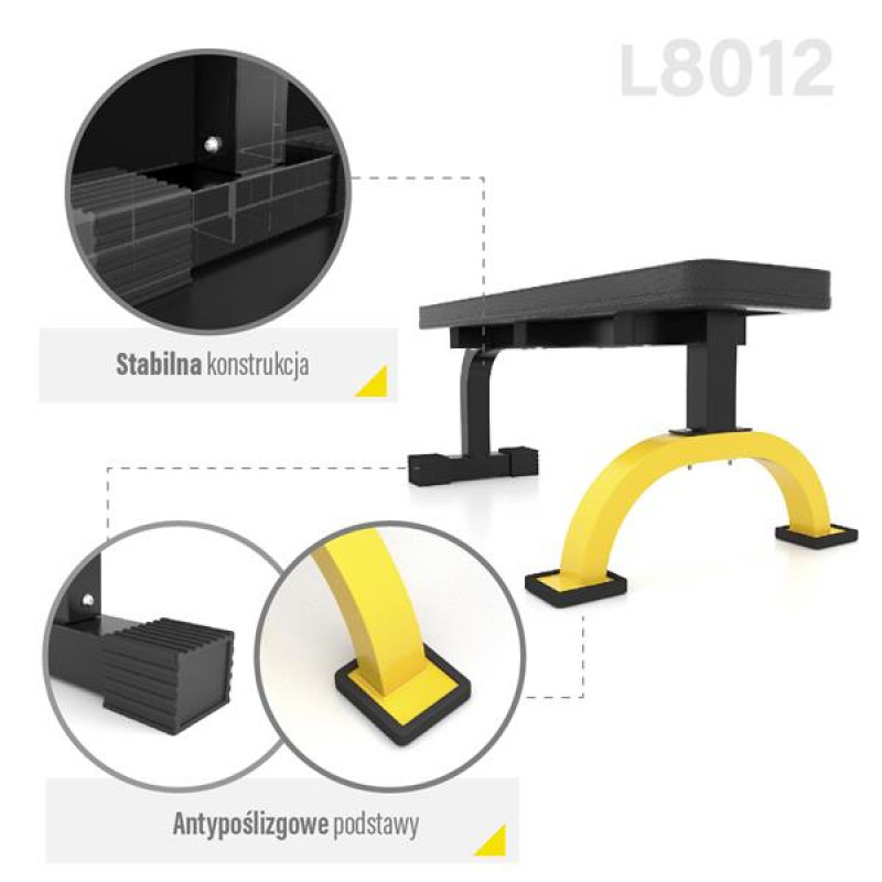 Попри міцну конструкцію, лавка має невелику вагу, тому дуже легко маневрувати її положенням. Модель L8012 - це горизонтальна лава. Вона не має можливості регулювати кут нахилу спинки. Це забезпечує максимальну стабільність. Комфорт і зручність Суцільна дошка забезпечує стабільність спинки, а м'яка губка пропонує комфорт і зручність під час тренування.
