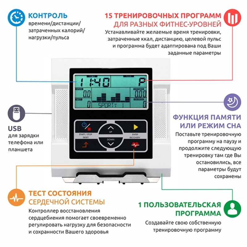 - сенсорні датчики вимірювання пульсу на рукоятках;