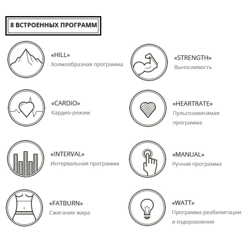 - Програмний модуль останнього покоління має 9 тренувальних програм, серед яких: ручний режим, пагорби, спалювання жиру, кардіо-режим, пульсозалежні програми, «5K10K» - програма бігу на 5 і 10 км, а також фітнес-тести;