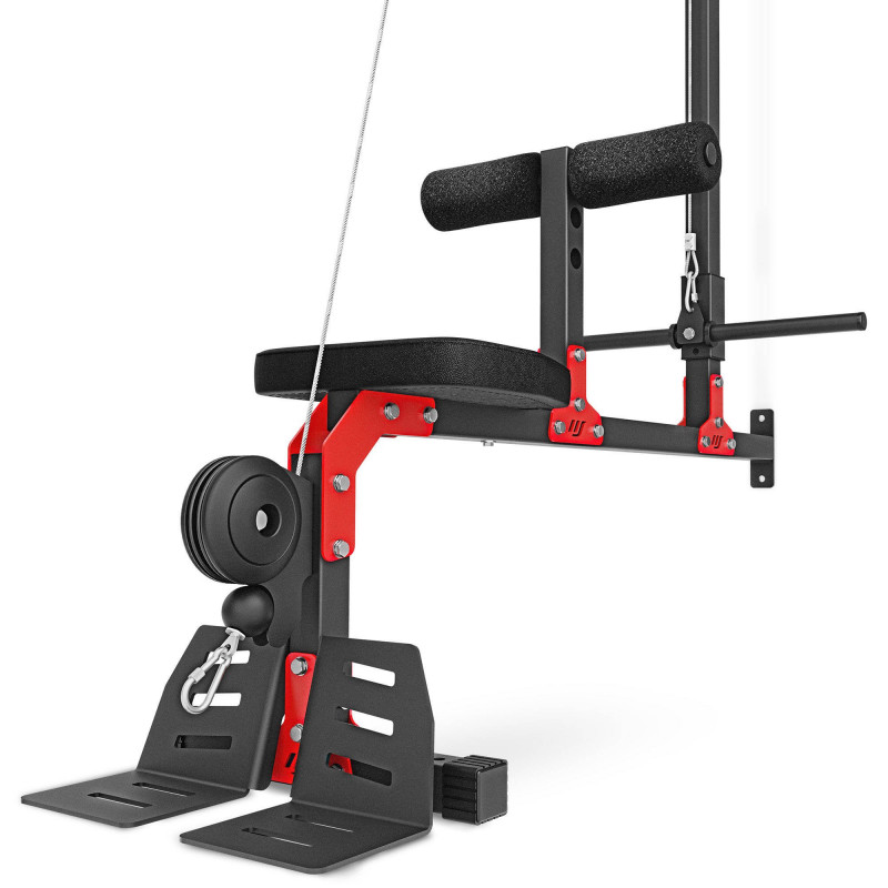 Якщо ви шукаєте недороге обладнання, виготовлене з увагою до деталей і найвищої якості — ми представляємо ще одну новинку в нашій пропозиції - верхня та нижня тяга з сидінням та платформою Marbo Sport MH-W102 2.0. У цьому тренажері шківи, що направляють кабель, були закриті червоними кожухами, а гвинтові з'єднання замасковані пластиковими ковпачками.