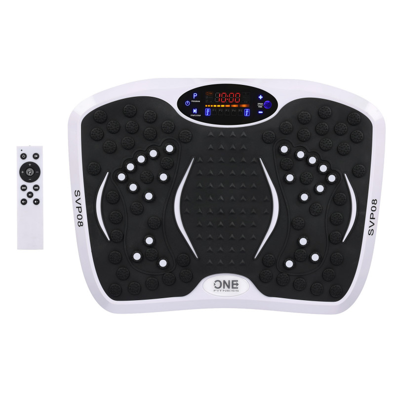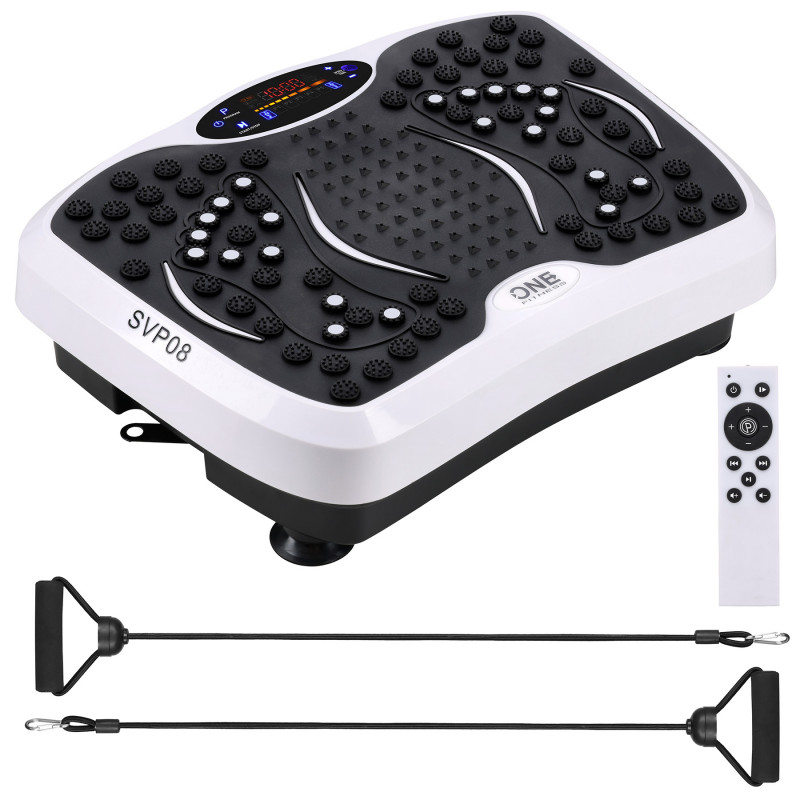 У комплект платформи SVP08 входять еластичні стрічки, які дозволяють одночасно тренувати верхню та нижню частини тіла. Завдяки їм вібраційна платформа стає універсальним фітнес-пристроєм, придатним для силових, кондиційних та корекційних вправ. Bluetooth, музика та зручне керування SVP08 One Fitness має функцію Bluetooth, що дозволяє відтворювати улюблену музику безпосередньо з платформи під час тренування. Зручна панель керування та пульт дистанційного керування, що входить до комплекту, забезпечують комфортне та інтуїтивне керування без переривання тренування.