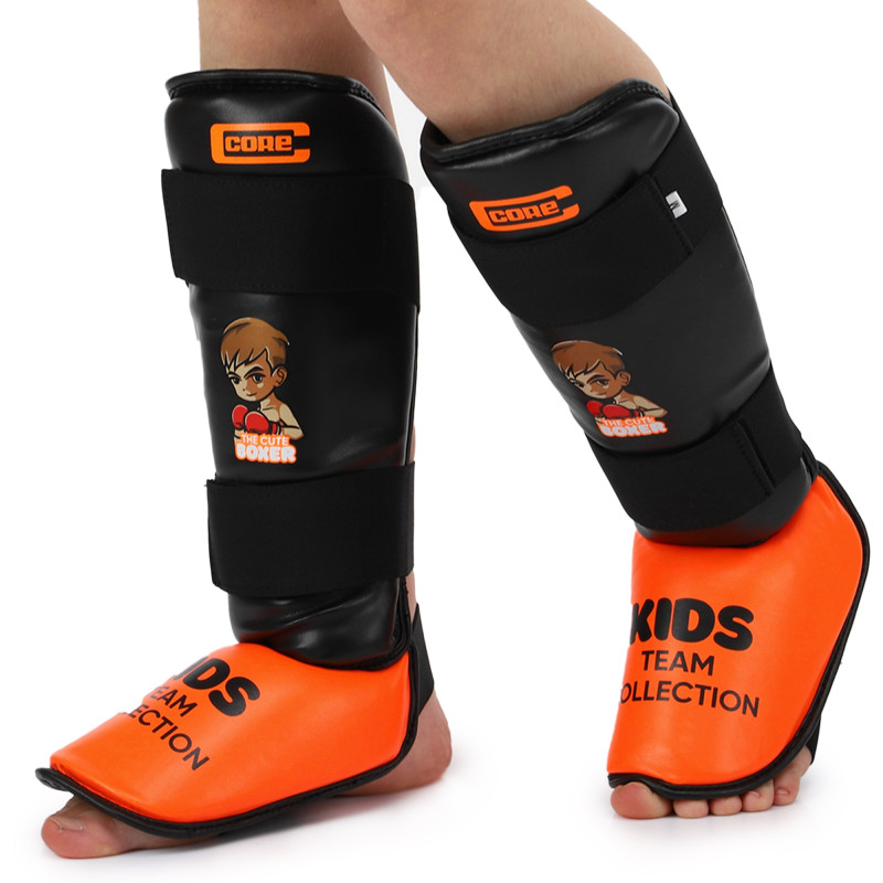 Захист гомілки та стопи дитячий Муай Тай, ММА, Кікбоксинг PU CORE BO-8544 XXS-M чорний-помаранчевий