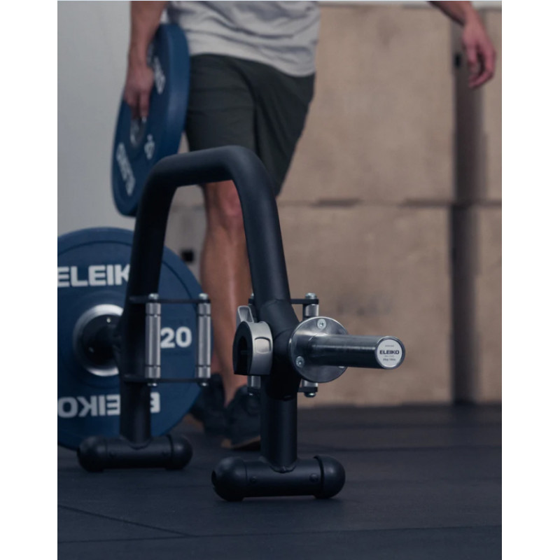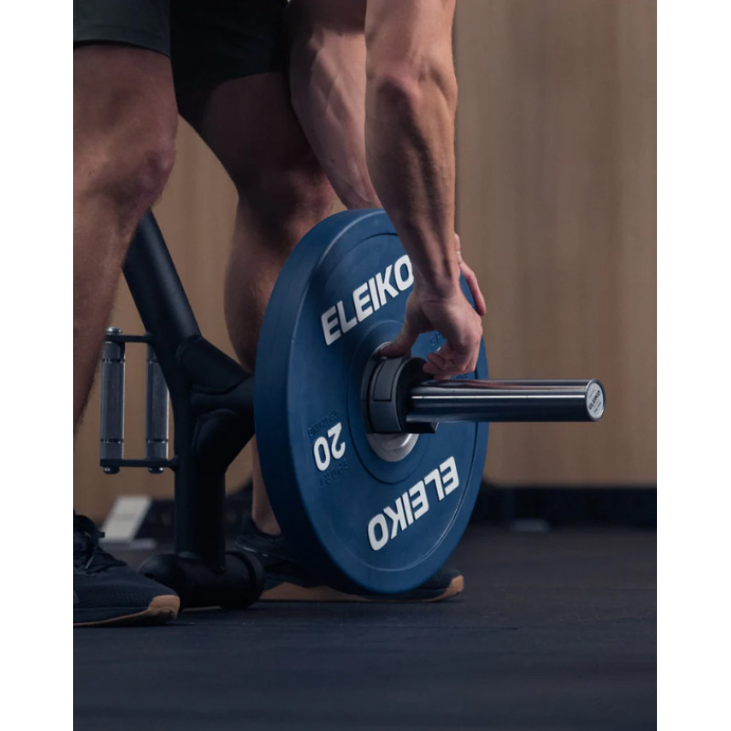 Щоб закріпити замки Eleiko Öppen, просто розмістіть кожен замок поруч із дисками та натисніть важіль униз, щоб зафіксувати його на місці.